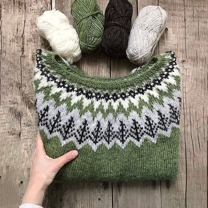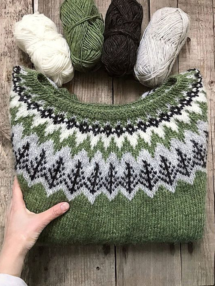 • Vintage Geometry Icelandic Pattern Printed Round Neck Knit Sweater