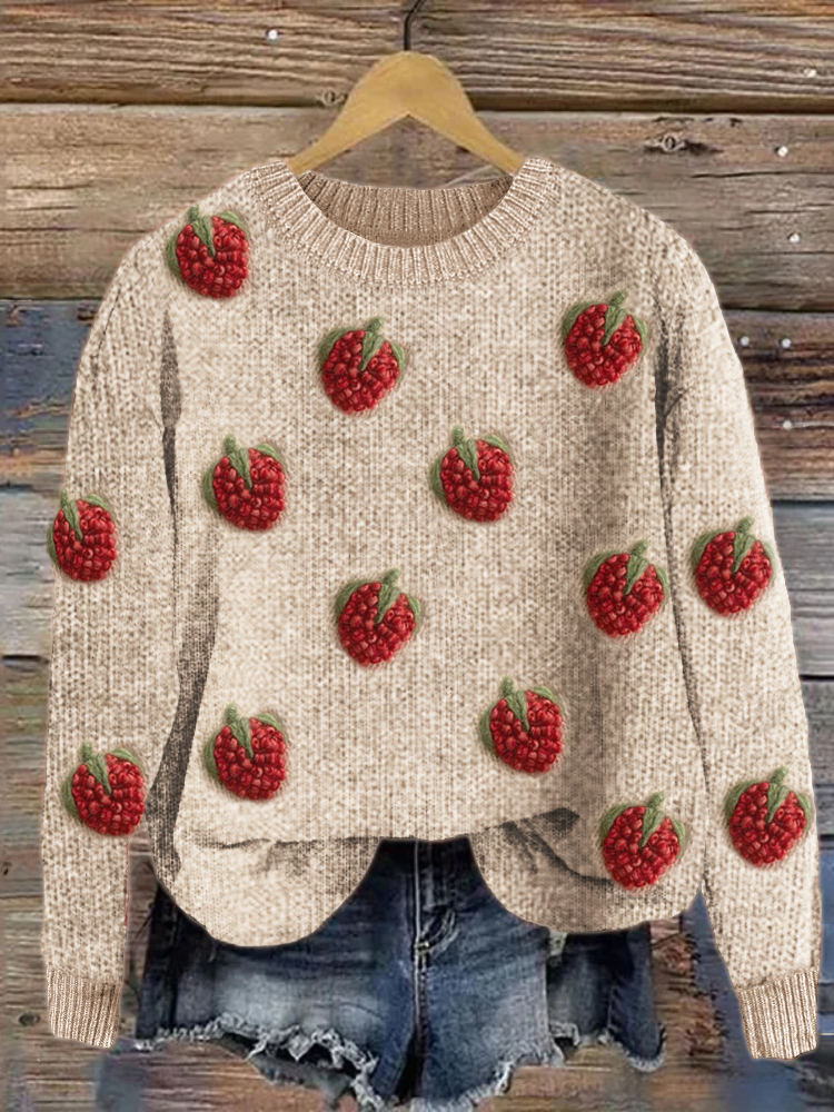 Hare behind Strawberry Embroidery Art Knit Sweater