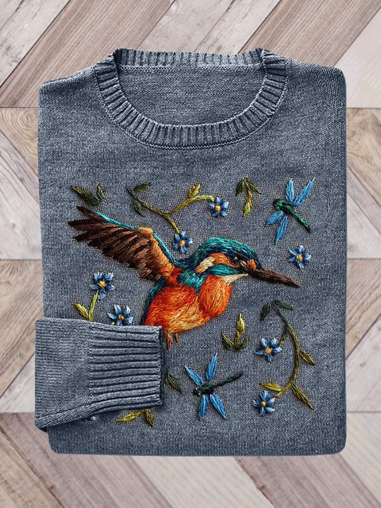 Hummingbird & Dragonflies Floral Embroidery Knit Sweater