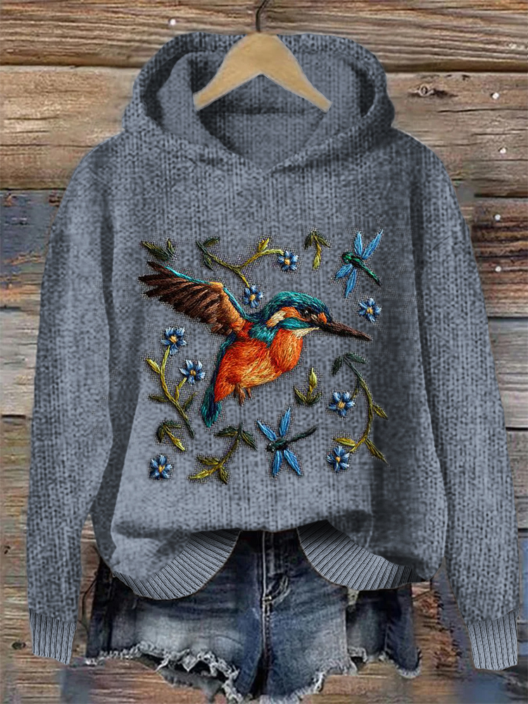 Hummingbird & Dragonflies Floral Embroidery Knit Hoodie