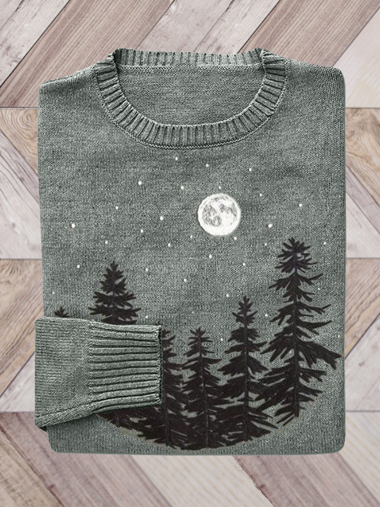 Full Moon Night Forest Embroidery Cozy Knit Sweater
