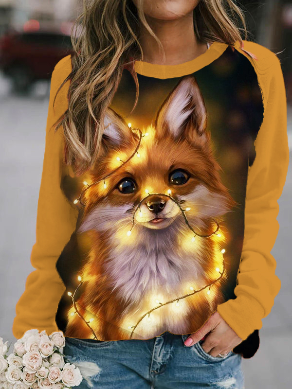 Fox And String Lights Print Long Sleeve Casual Sweatshirt