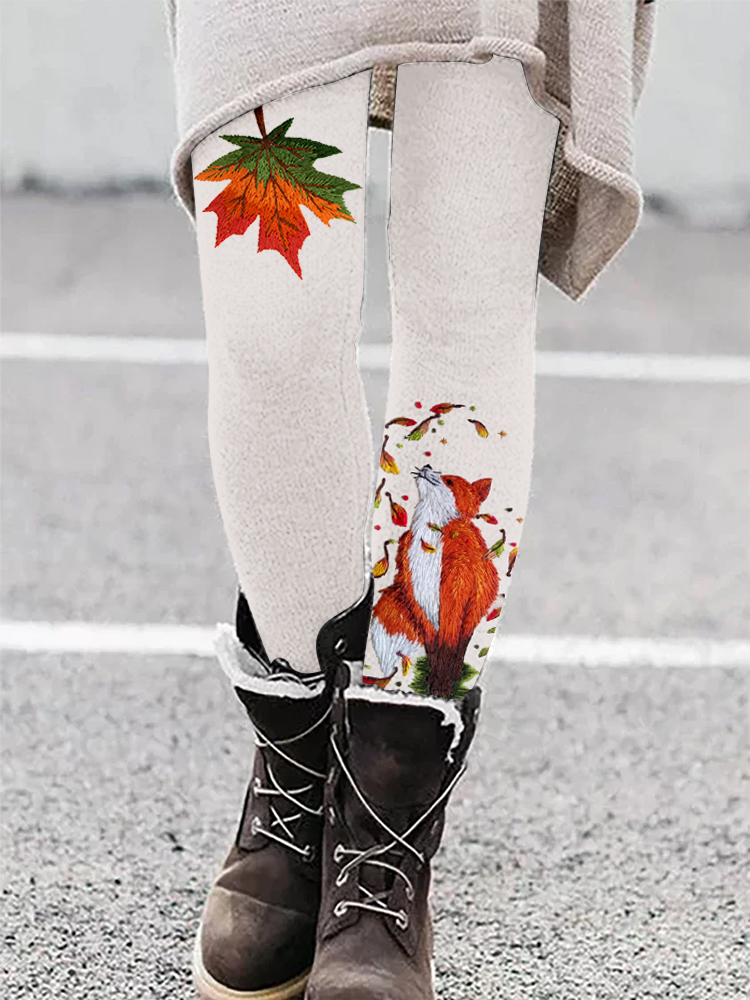 Fox & Maple Leaf Embroidery Art Comfy Leggings