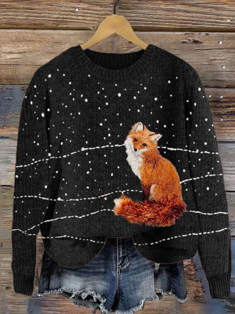 Fuzzy Fox in the Snow Embroidery Cozy Knit Sweater