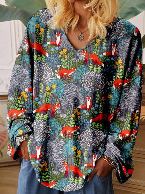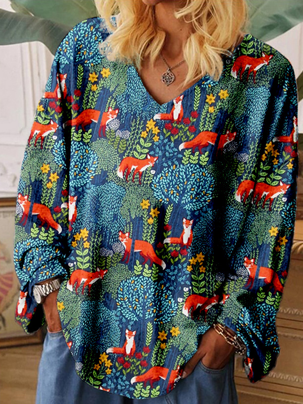 Fox in the Forest Graphic V Neck Comfy T Shirt