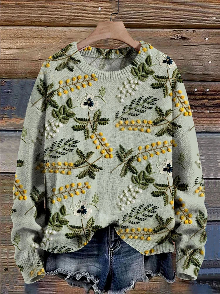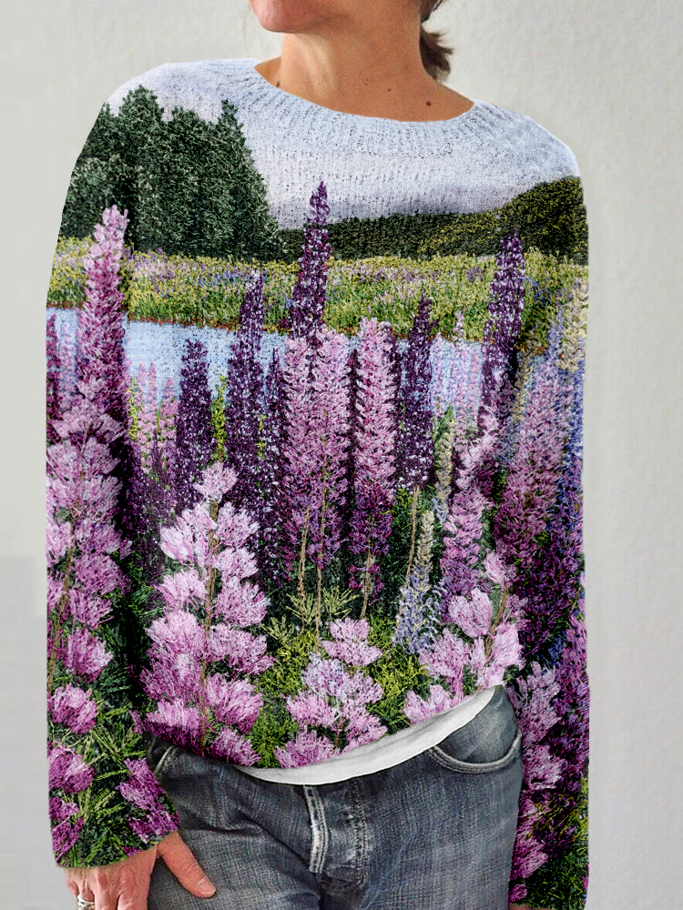 Lupins Embroidery Art Crew Neck Cozy Knit Sweater