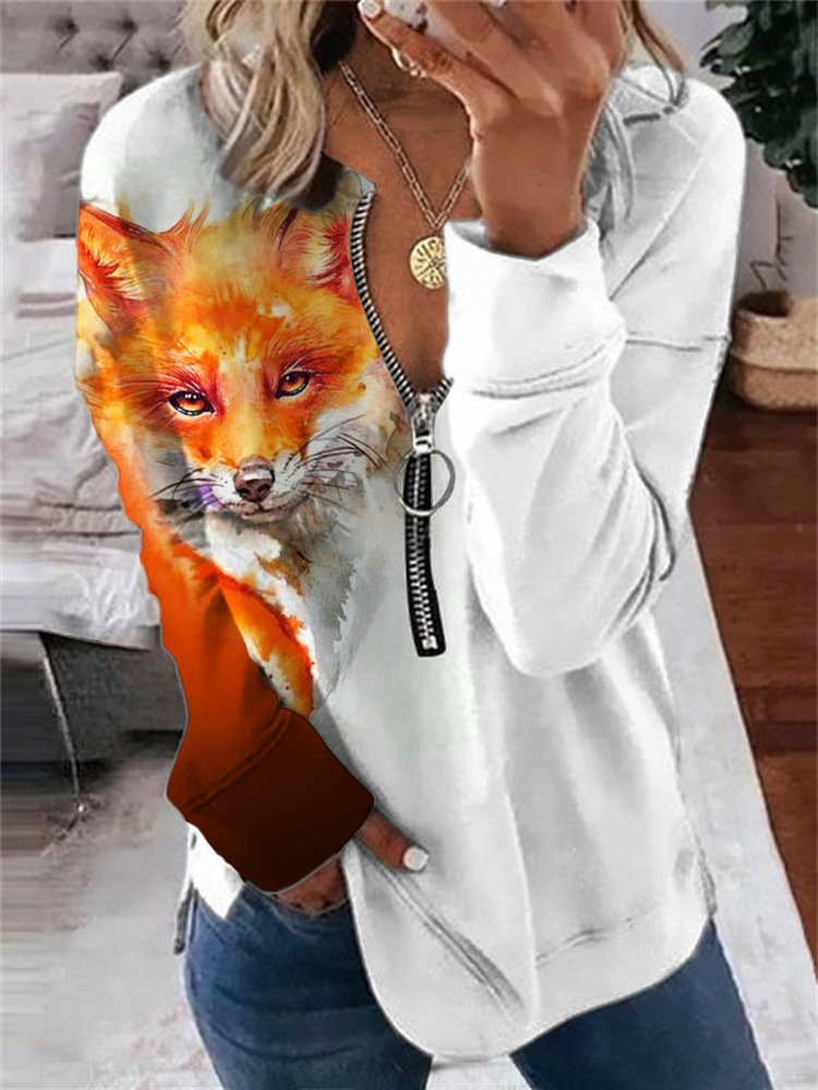 Fox Watercolor Art Contrast Color Zip Up Sweatshirt