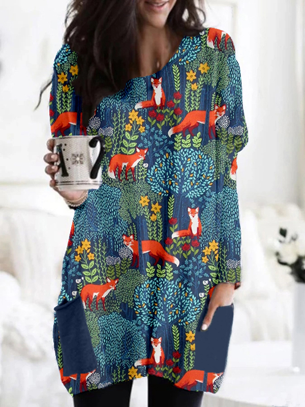Fox in the Forest Graphic Comfy Patch Pocket Tunic