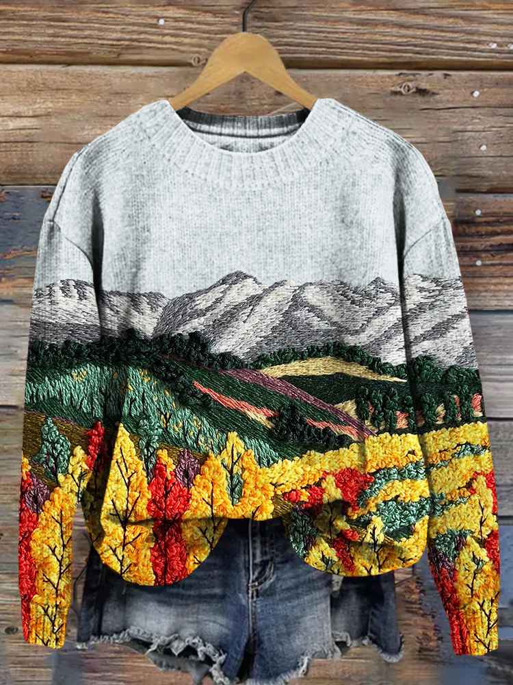 Mountain Range and Forest Embroidery Art Cozy Sweater