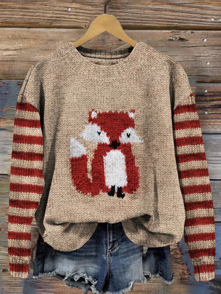 Lovely Fox Knit Art Stripe Sleeve Cozy Sweater