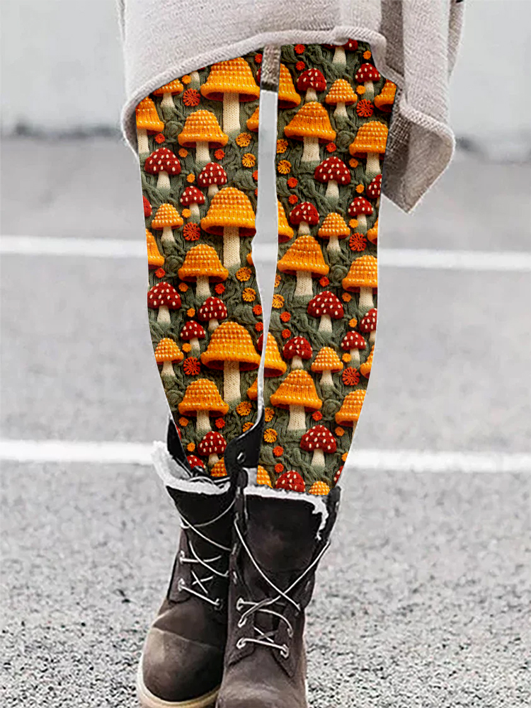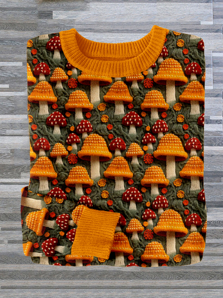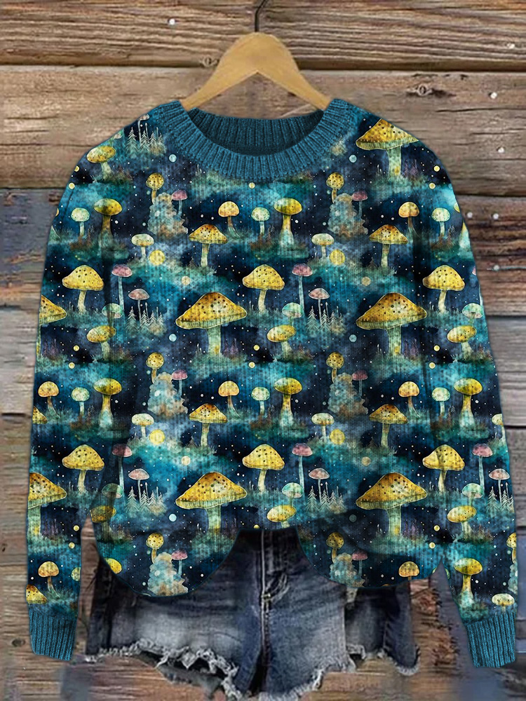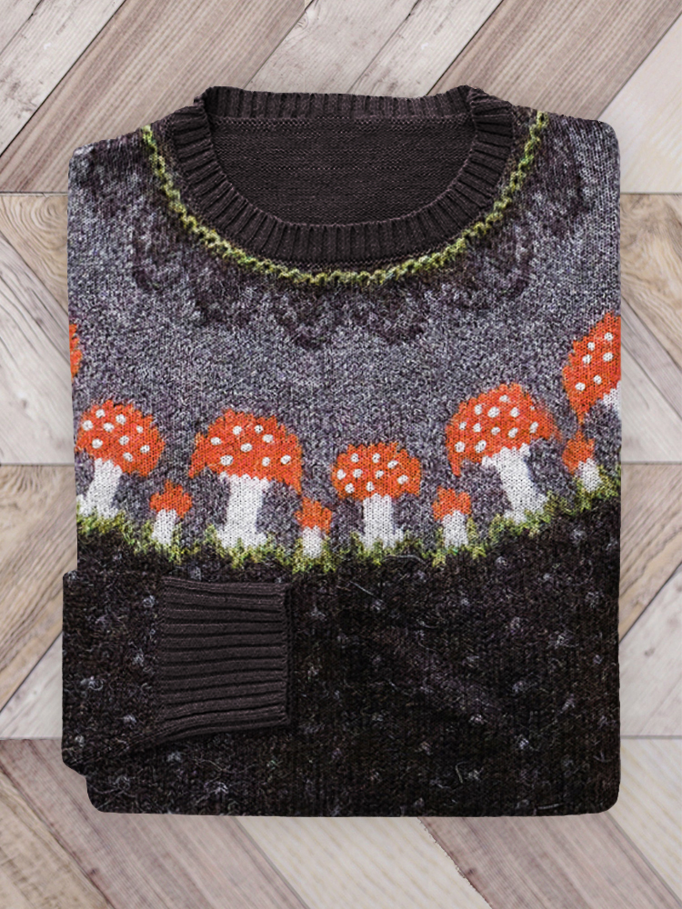 Forest Mushroom & Leaves Pattern Cozy Knit Sweater