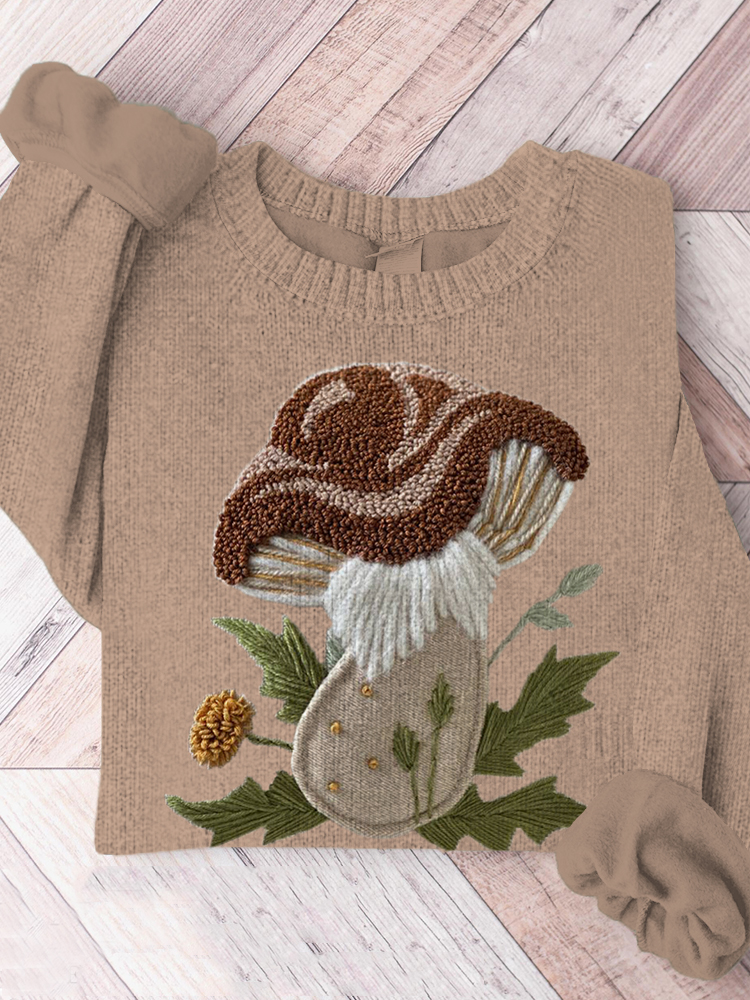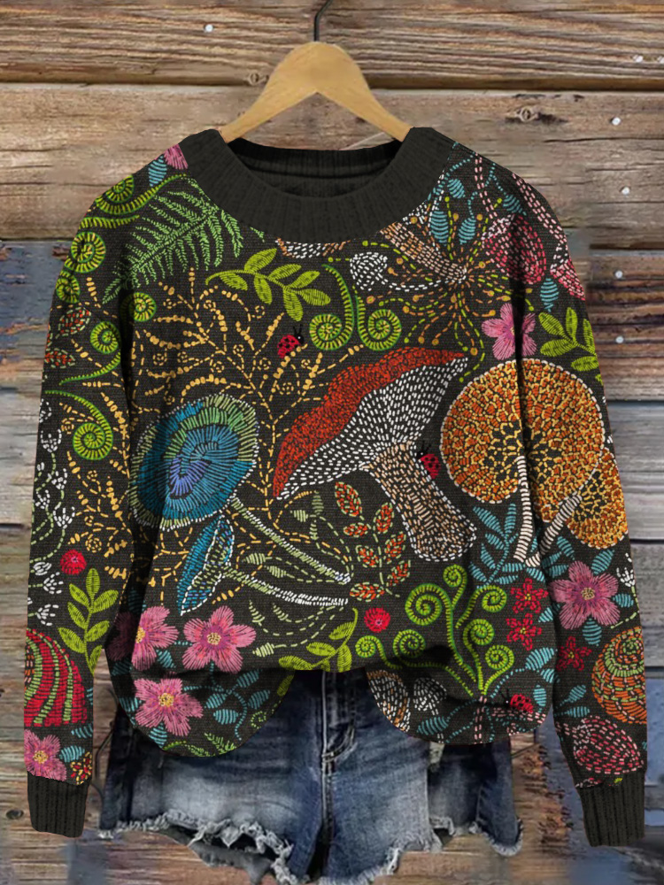 Floral and Mushroom Embroidery Art Cozy Knit Sweater