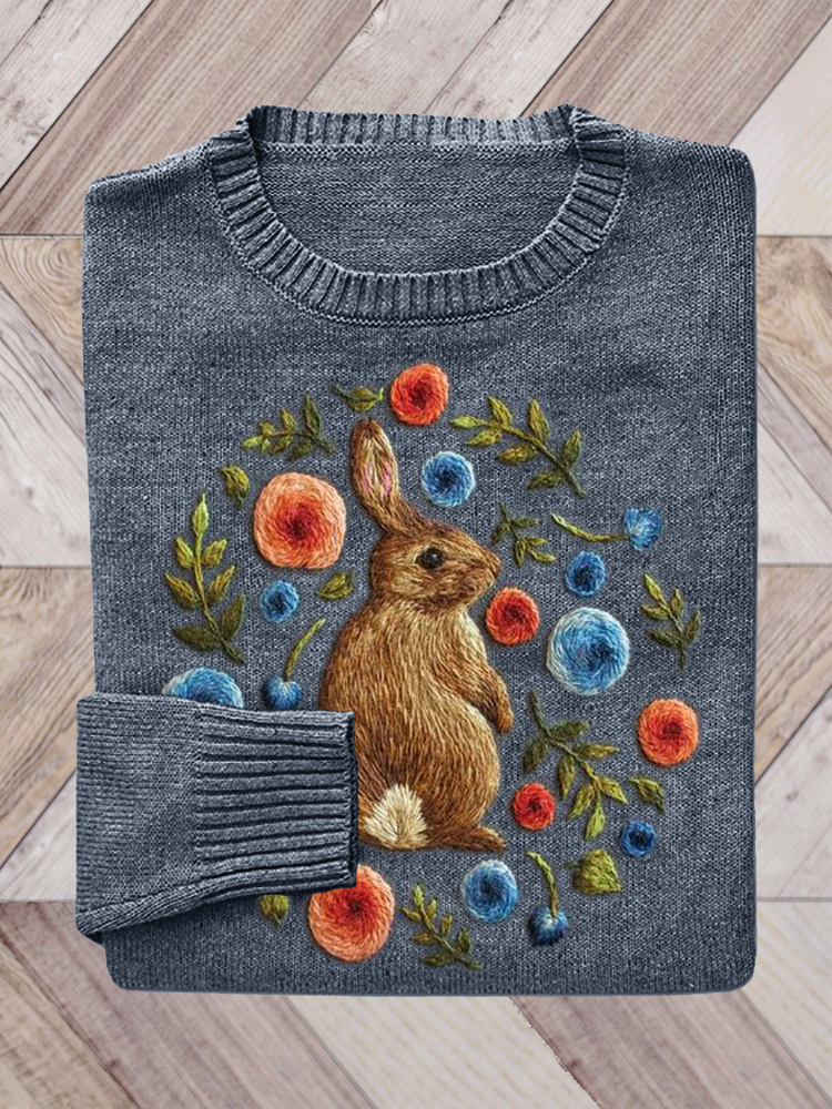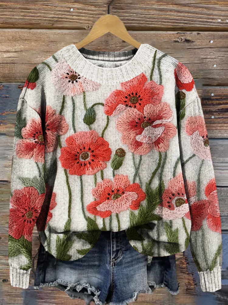 Embroidered Flowers Art Crew Neck Cozy Knit Sweater