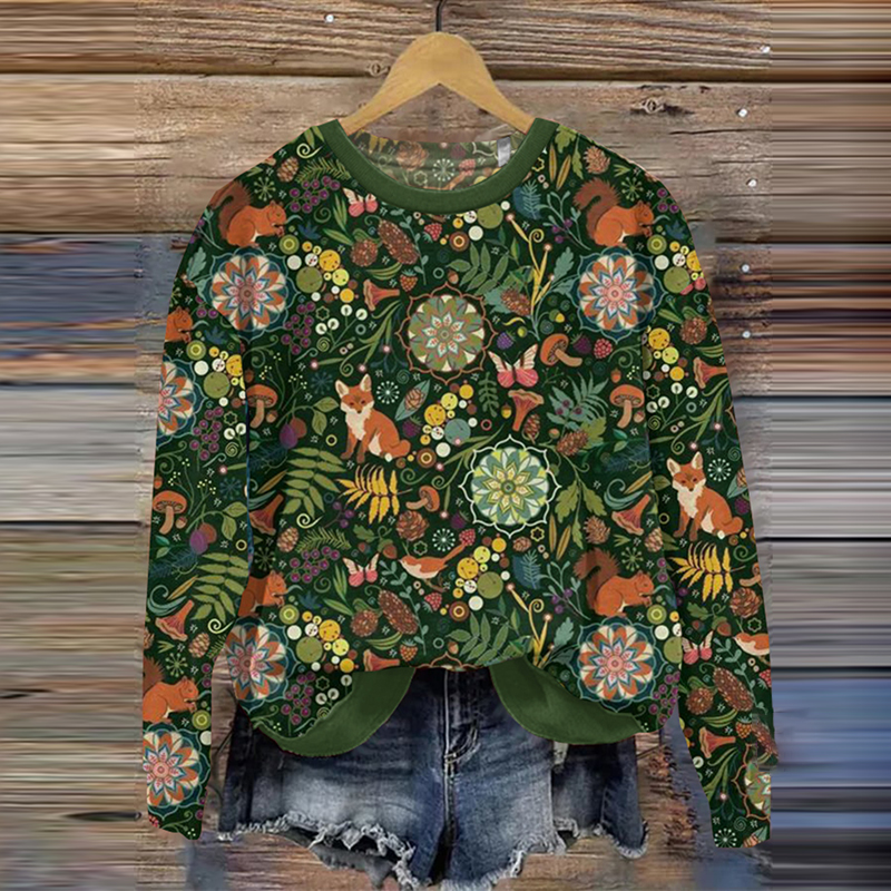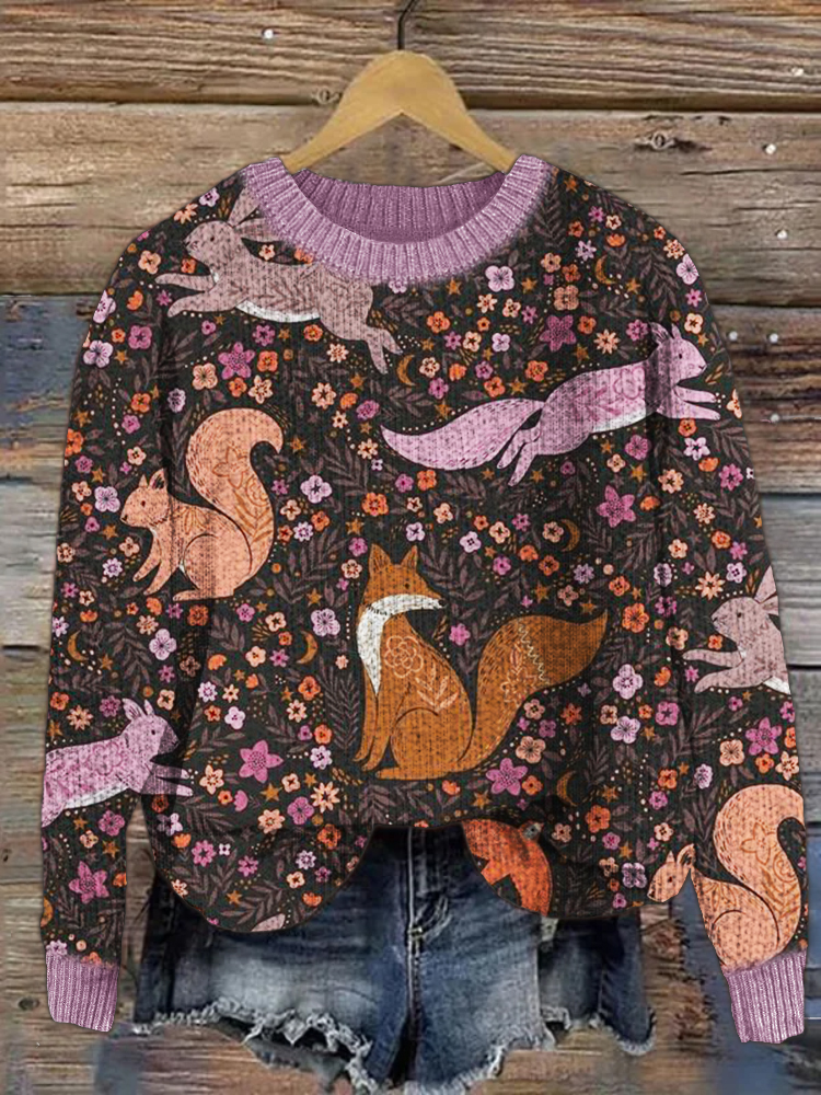 Forest Animals Floral Pattern Cozy Knit Sweater