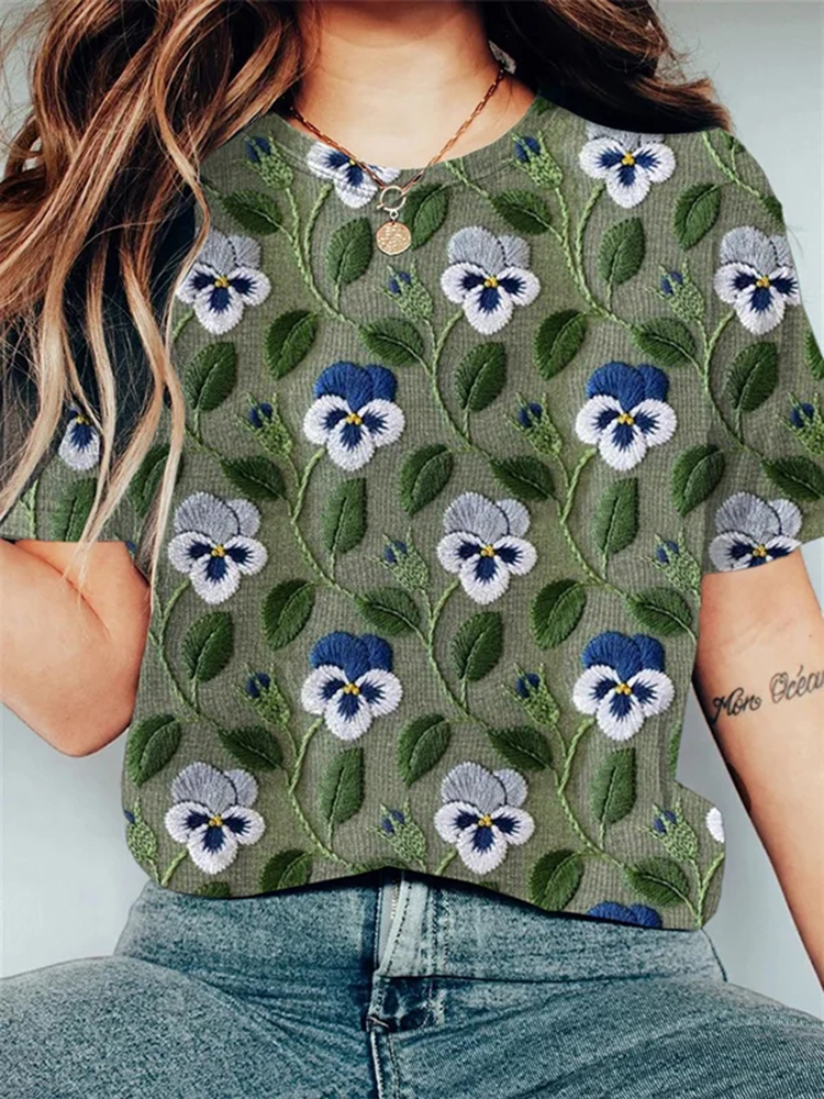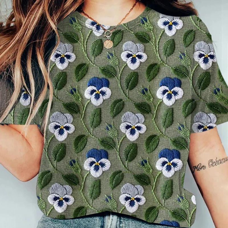 Embroidery Small White Flowers Print Short Sleeve Tees
