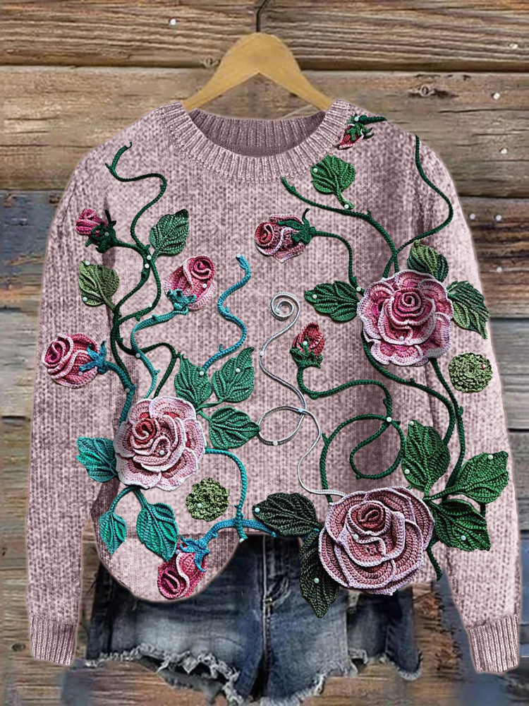 Classy Roses Vines Crochet Art Cozy Knit Sweater