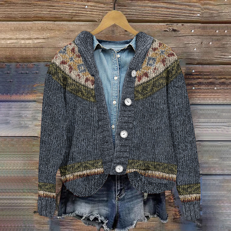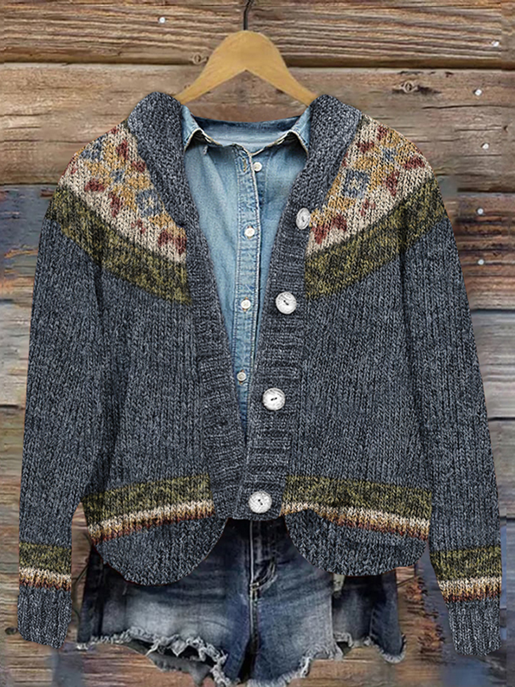 Button Color Block Icelandic Pattern Printed Cardigan