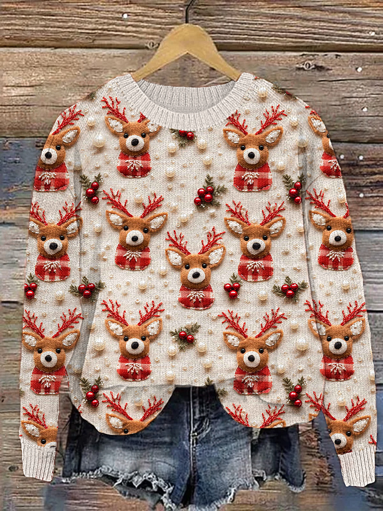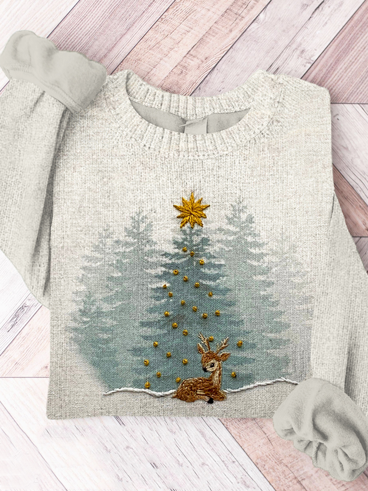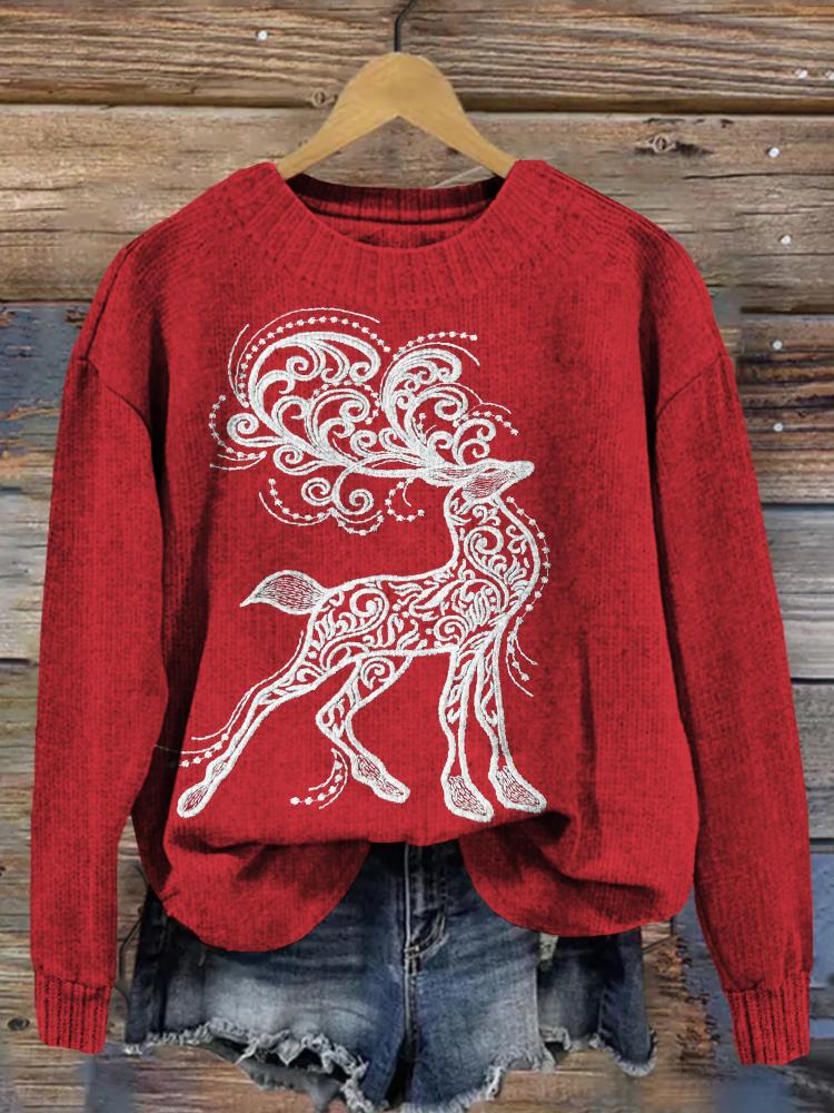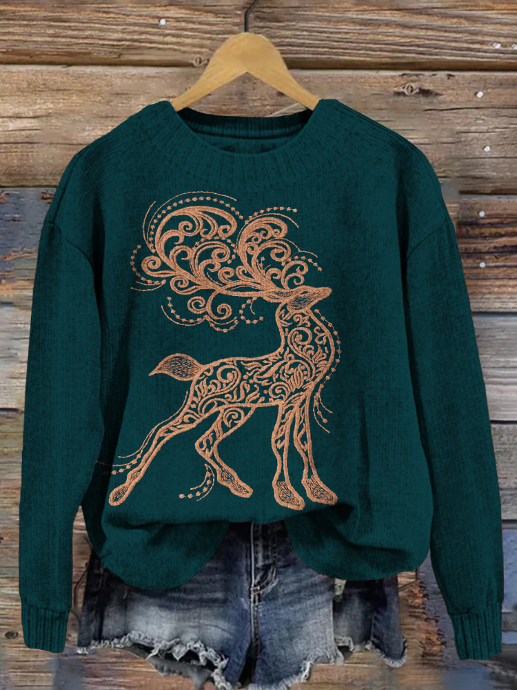 Christmas Deer Embroidery Art Cozy Knit Sweater