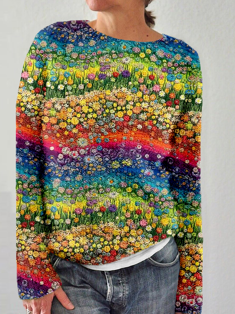 Colorful Flowers Embroidery Art Comfy Sweater
