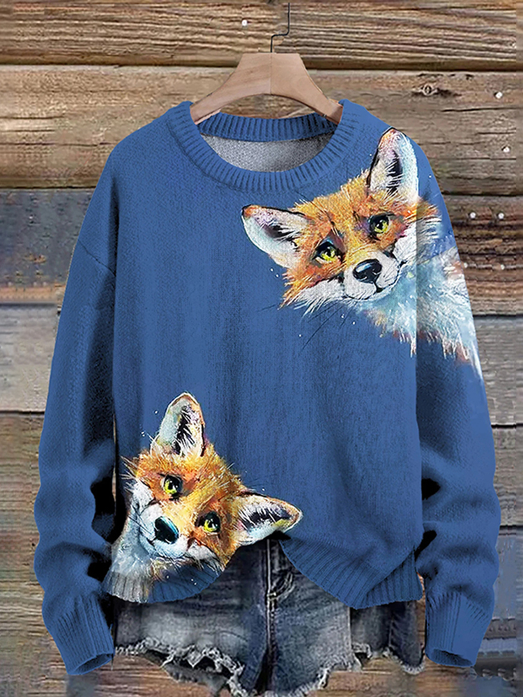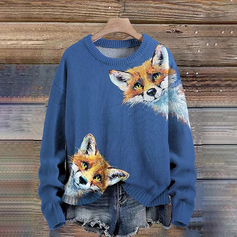 Cute Fox Art Pattern Print Casual Knit Pullover Sweater