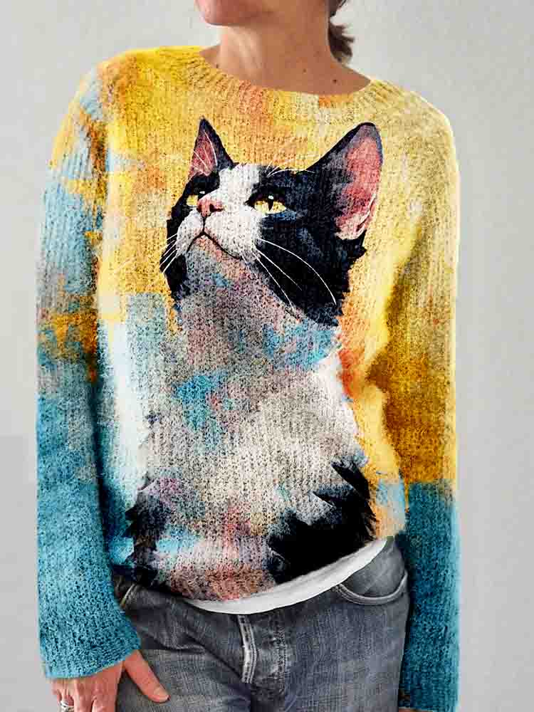 Cute Cat Art Print Knitted Comfy Sweater