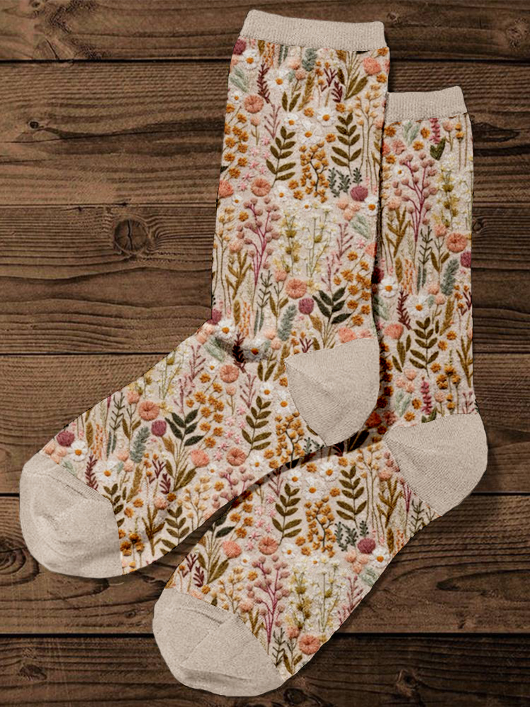 Wildflower Meadow Floral Embroidery Art Comfy Socks