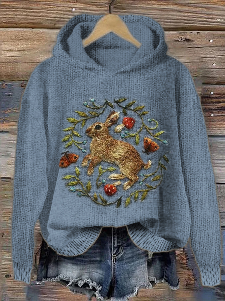Forest Hare & Mushroom Embroidery Art Knit Hoodie