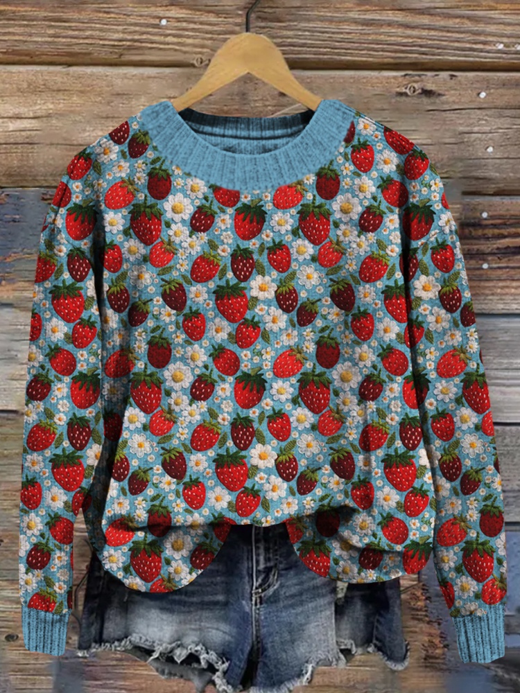 Felt Strawberries and Flowers Embroidery Art Cozy Sweater