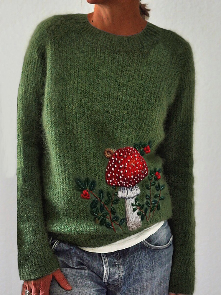 Forest Fresh Mushroom Embroidery Art Cozy Knit Sweater
