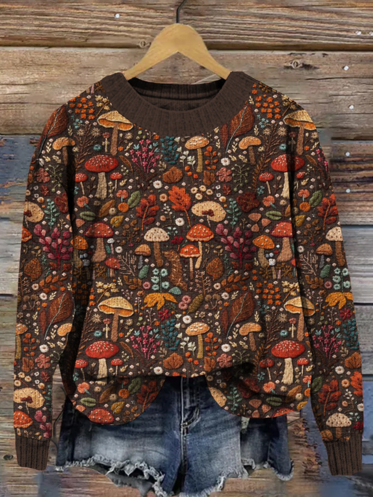 Forest Mushroom Floral Embroidery Art Cozy Knit Sweater