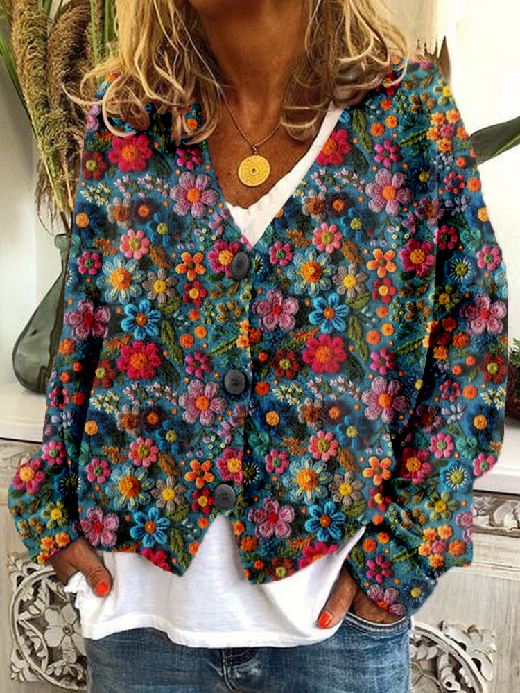 Colorful Flowers Embroidery Art Cozy Cardigan