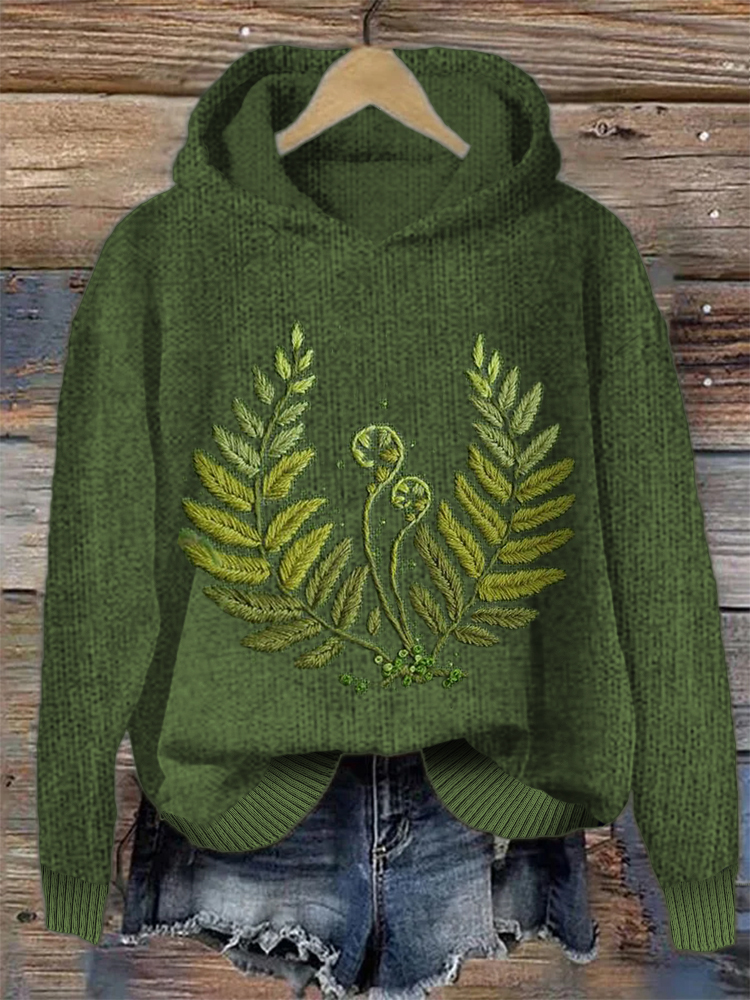 Forest Fern Embroidery Art Cozy Knit Hoodie