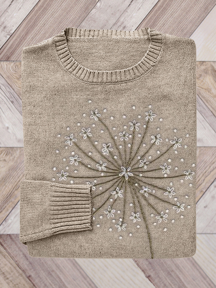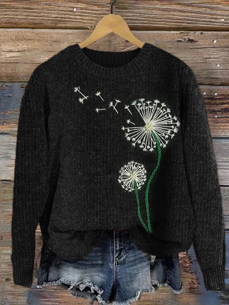 Classy Dandelion Embroidery Art Cozy Knit Sweater