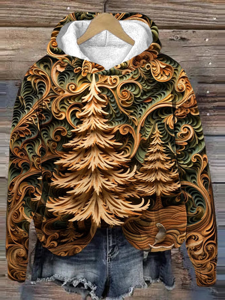 Carved Wood Christmas Tree Print Long Sleeve Hoodie