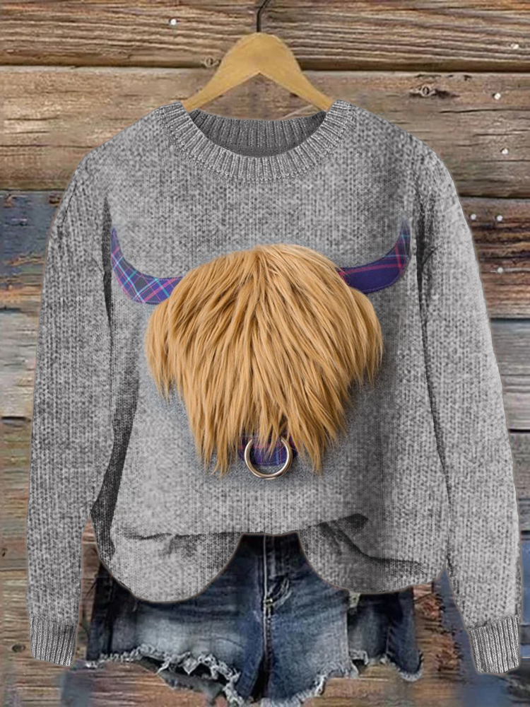 Fuzzy Highland Cow Plush Cozy Knit Sweater